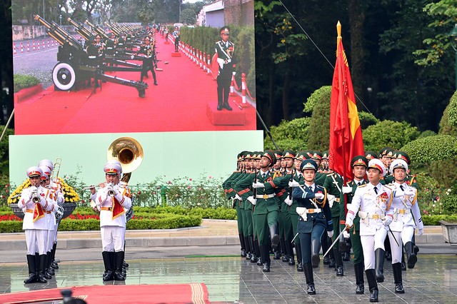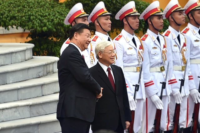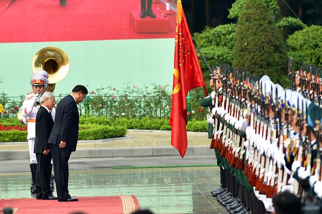 Đúng 16 giờ, đoàn xe chở Tổng Bí thư, Chủ tịch Trung Quốc Tập Cận Bình tiến vào Phủ Chủ tịch. Tổng Bí thư Nguyễn Phú Trọng nồng nhiệt chào đón và mời Tổng Bí thư, Chủ tịch Trung Quốc Tập Cận Bình bước lên bục danh dự. Những loạt đại bác vang lên hùng tráng. Quân nhạc cử quốc thiều hai nước. Tổng Bí thư Nguyễn Phú Trọng và Tổng Bí thư, Chủ tịch Trung Quốc Tập Cận Bình duyệt đội danh dự Quân đội nhân dân Việt Nam và giới thiệu các quan chức hai bên có mặt tại Lễ đón.