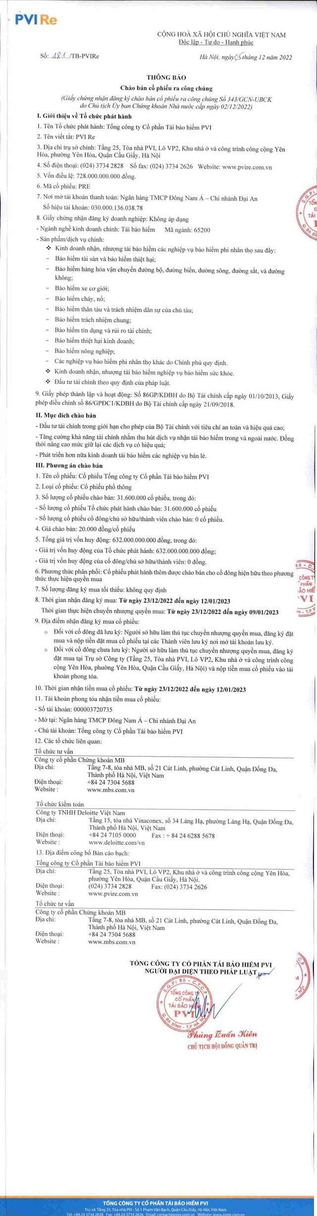 Tổng công ty Cổ phần Tái bảo hiểm PVI thông báo chào bán cổ phiếu ra công chúng