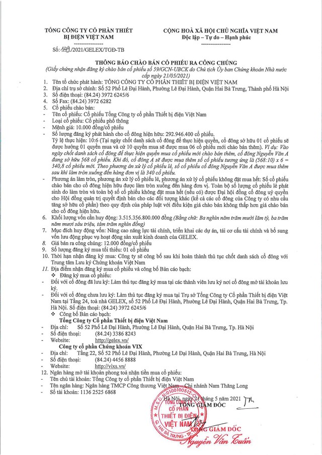 Tổng công ty cổ phần Thiết bị điện Việt Nam thông báo chào bán cổ phiếu ra công chúng