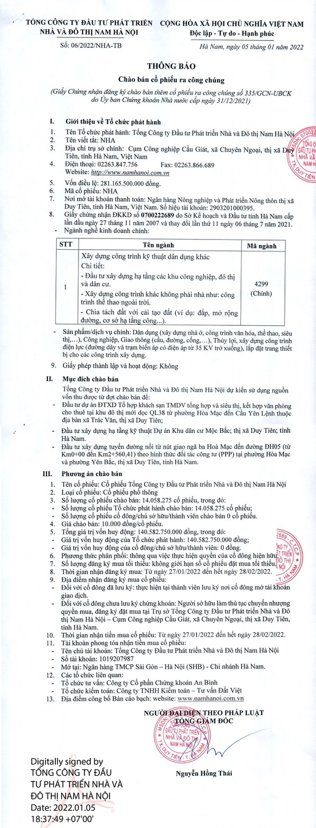 Tổng công ty Đầu tư Phát triển Nhà và Đô thị Nam Hà Nội (NHA) thông báo chào bán cổ phiếu ra công chúng