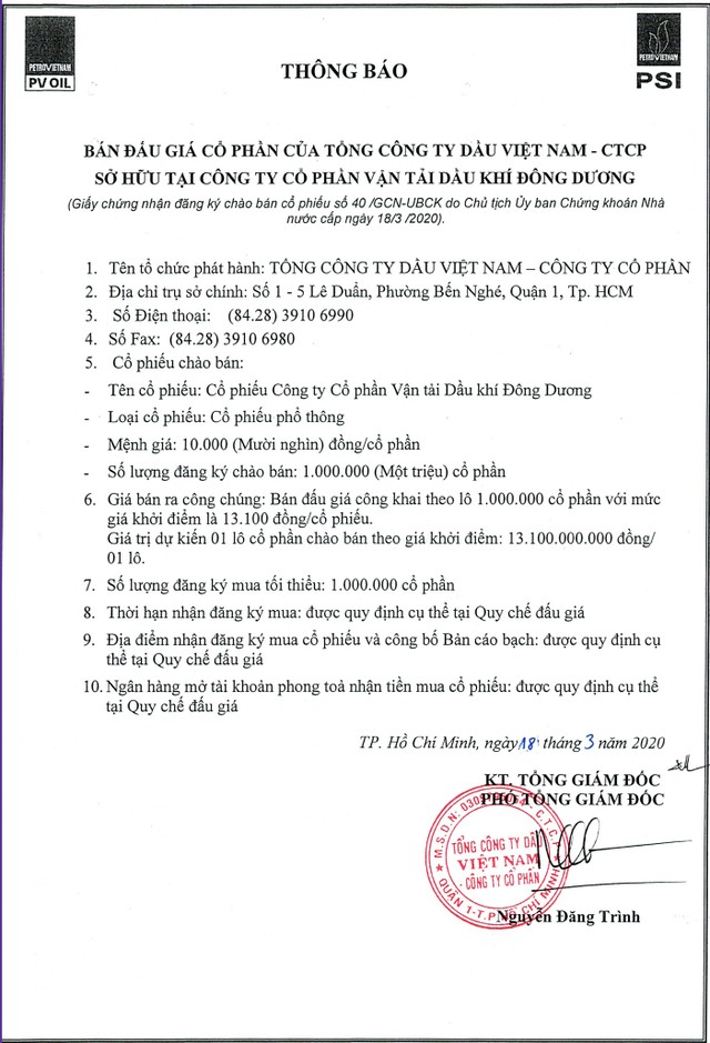 Tổng công ty Dầu Việt Nam (PVOIL) thông báo bán đấu giá cổ phần sở hữu tại CTCP Vận tải Dầu khí Đông Dương