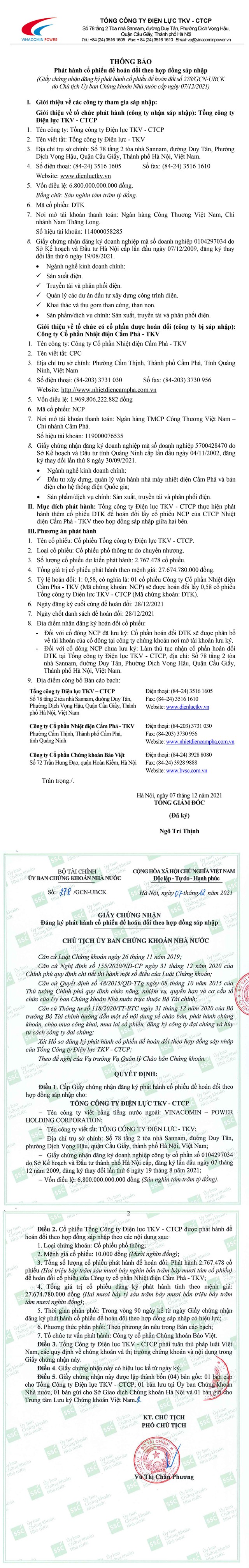 Tổng công ty Điện lực TKV - CTCP thông báo phát hành cổ phiếu hoán đổi sáp nhập
