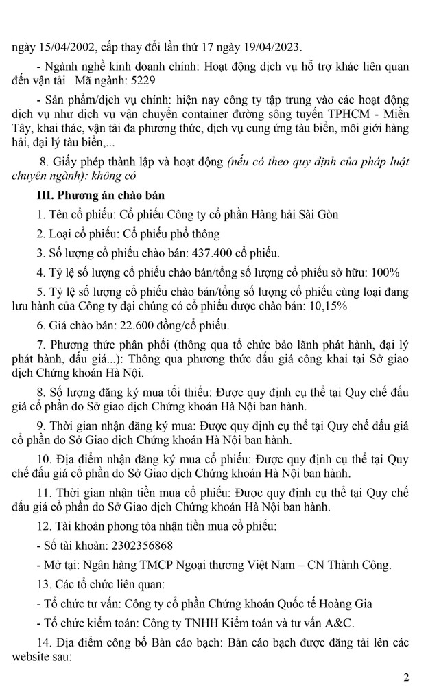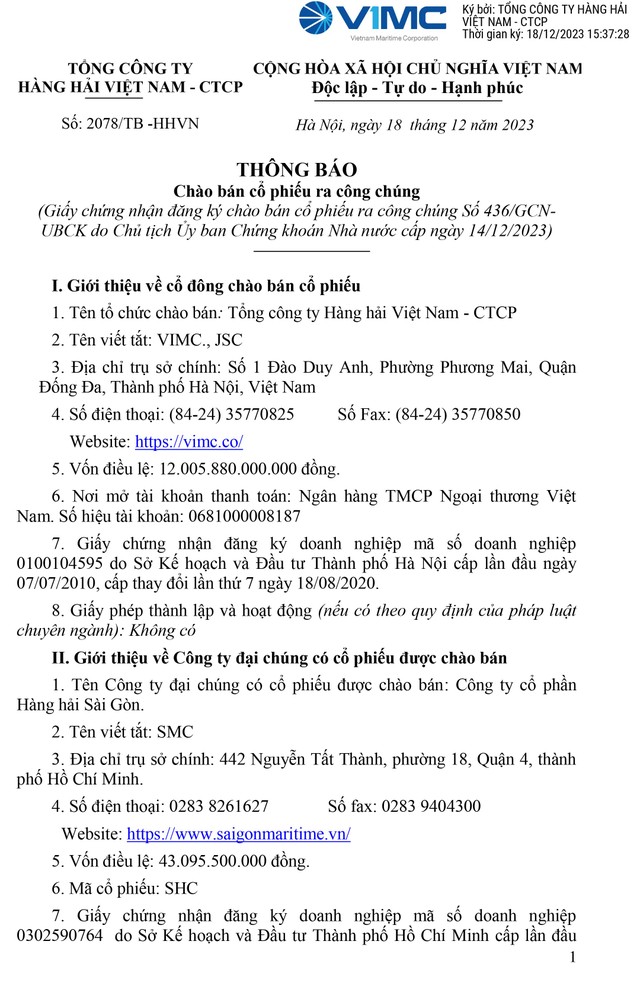 Tổng công ty Hàng hải Việt Nam (VIMC) thông báo chào bán cổ phiếu Công ty cổ phần Hàng hải Sài Gòn ra công chúng