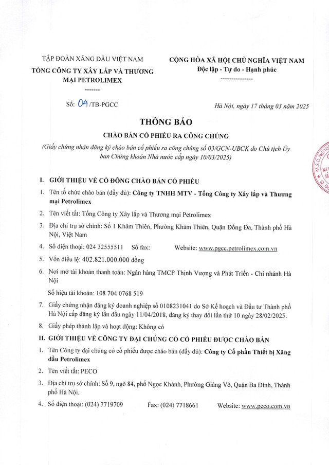 Tổng công ty Xây lắp và Thương mại Petrolimex thông báo chào bán cổ phiếu ra công chúng (kỳ 2)