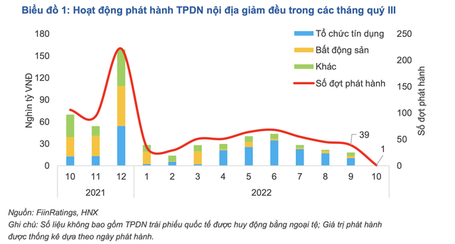 Báo cáo trái phiếu tháng 10 của Fiinratings cho biết, tính đến hết tháng 10, giá trị trái phiếu bất động sản đang lưu hành có quy mô 445.000 tỷ đồng, tương ứng gần 34% tổng giá trị trái phiếu riêng lẻ đang lưu hành; gần 50% tổng giá trị trái phiếu của các tổ chức doanh nghiệp phi tài chính (đạt hơn 896.000 tỷ đồng).