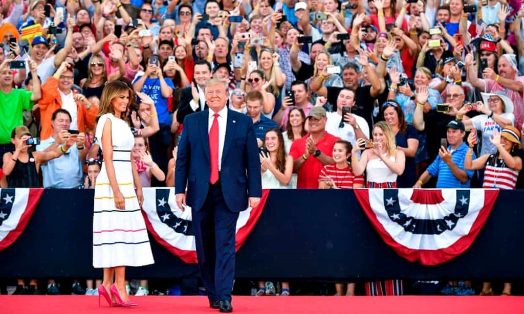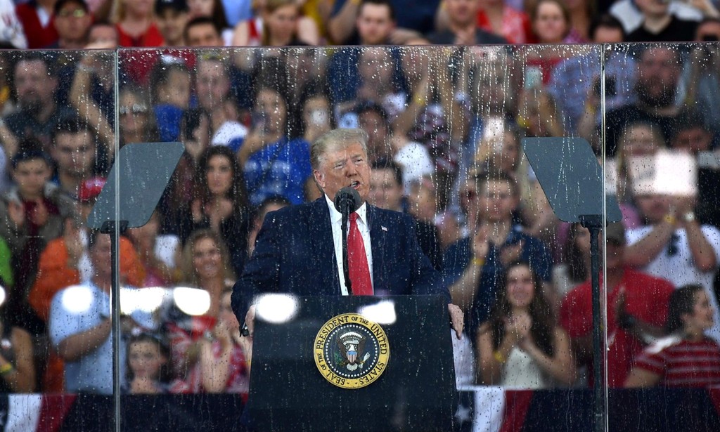 Ông Trump là tổng thống Mỹ đầu tiên trong 7 thập kỷ phát biểu trước công chúng tại công viên National Mall trong ngày quốc khánh nước này. "Vào ngày này 243 năm trước, những vị cha già lập quốc đã hiến dâng tính mạng của họ, tài sản của họ và danh dự thiêng liêng của họ để bảo vệ các quyền mà Thượng đế ban cho chúng ta", ông Trump phát biểu, bất chấp mưa gió. Ảnh: AFP/Getty.
