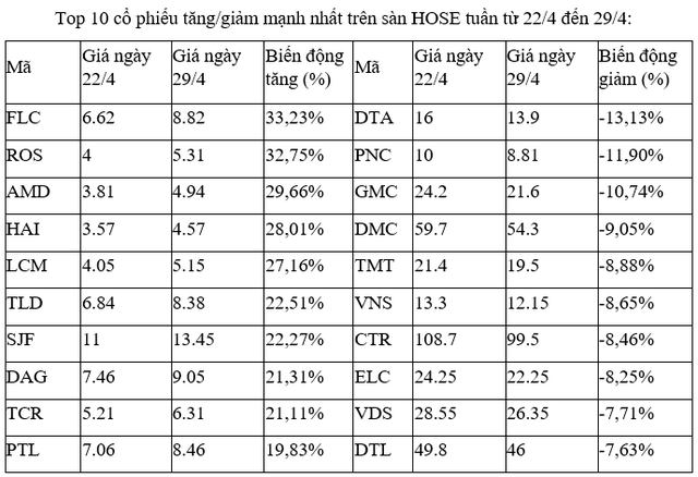 Đáng chú ý là họ nhà FLC với FLC, ROS, AMD và HAI nhận lực lực cầu bắt đáy mạnh nhất và đã chiếm lĩnh cả 4 vị trí dẫn đầu các mã tăng cao nhất trên sàn.