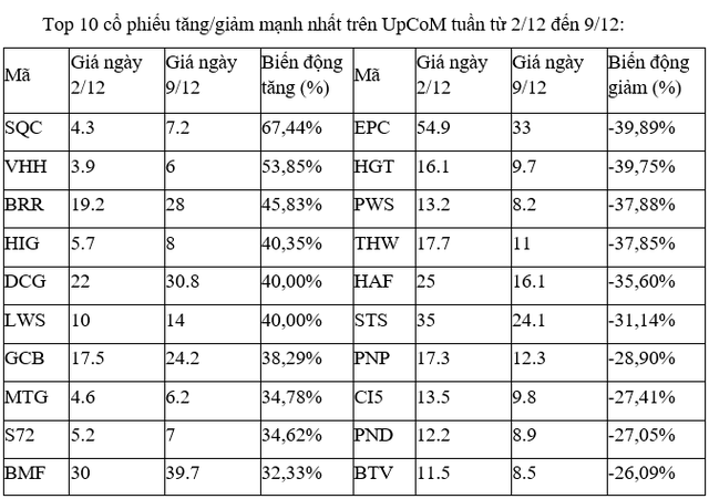 Trên UpCoM, các cổ phiếu tăng, giảm mạnh nhất sàn không có điểm đáng chú ý nào đáng kể, khi chỉ có giao dịch với khối lượng thấp trong các phiên.