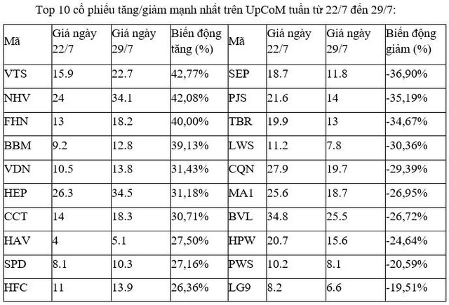 Trên UpCoM, các cổ phiếu tăng, giảm mạnh nhất đều ít có diễn biến đáng chú ý, khi đa số đều thanh khoản thấp, thậm chí không ít còn trắng giao dịch trong các phiên.