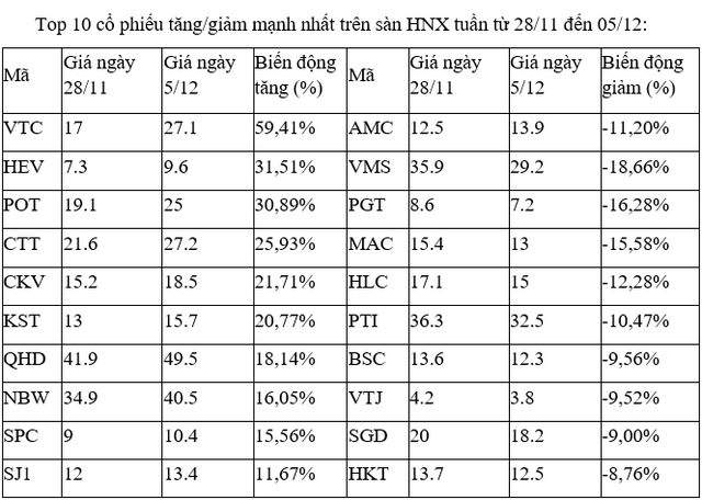 Trên sàn HNX, cổ phiếu VTC của CTCP Viễn thông VTC tiếp tục có tuần thứ hai liên tiếp là cổ phiếu tăng tốt nhất sau khi tăng hơn 57% trong tuần trước đó.