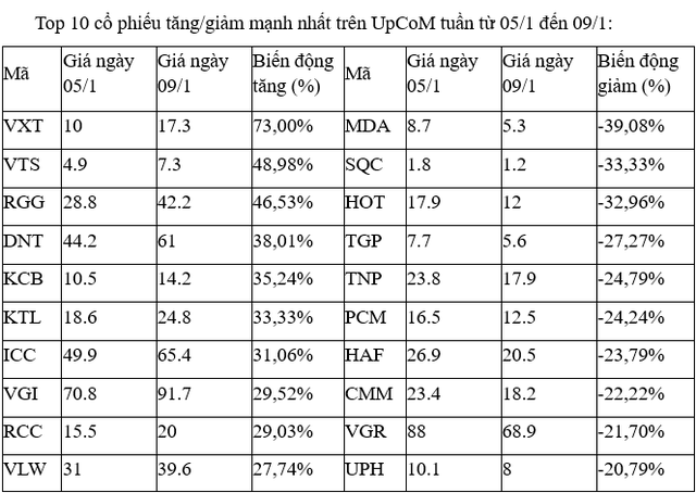 Trên UpCoM, đa phần các cổ phiếu biến động tăng, giảm mạnh nhất đều chỉ có thanh khoản thấp, ngoại trừ cổ phiếu KCB và đáng lưu ý nhất là VGI.