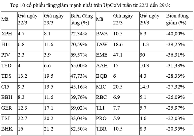 Trên UpCoM, các cổ phiếu H11, PIV tuần này nổi bật với liên tiếp những phiên tăng kịch trần, dù thanh khoản chỉ vài chục nghìn đơn vị khớp lệnh/phiên.
