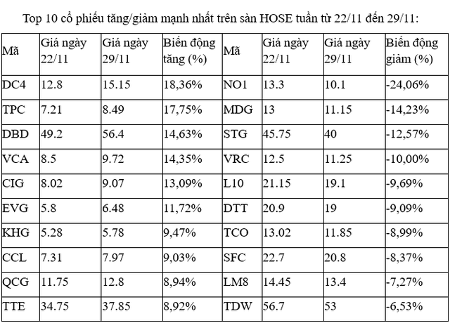 Trên sàn HOSE, tuần này cổ phiếu DC4 tăng mạnh nhất với hai phiên tăng kịch trần, khối lượng khớp lệnh trung bình từ 0,5 triệu đến 0,8 triệu đơn vị/phiên. Tuần trước, một cổ phiếu khác liên quan là DC2 cũng là quán quân tăng giá trên sàn, dù thanh khoản khá thấp.