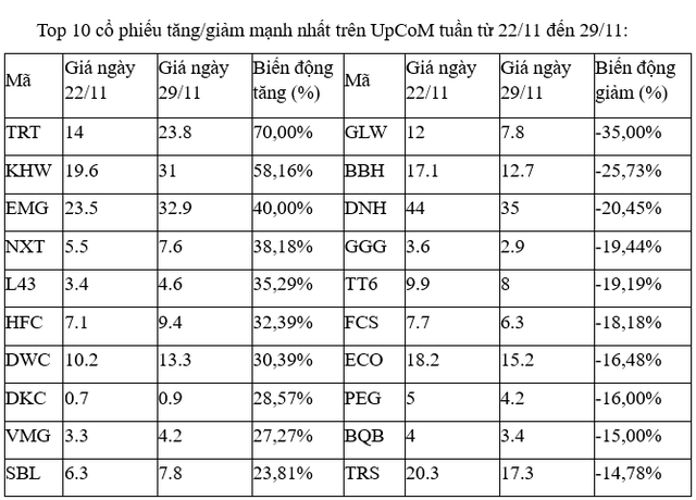Trên UpCoM, các cổ phiếu tăng giảm mạnh nhất tuần thêm một tuần ít có điểm nhấn đáng kể nào, khi đều chỉ có thanh khoản thấp trong các phiên. Trong đó, cổ phiếu ECO phần nào có khối lượng khớp lệnh khá tốt, nhưng phiên cao nhất cũng chỉ hơn 0,23 triệu đơn vị.
