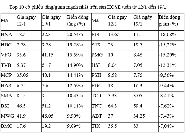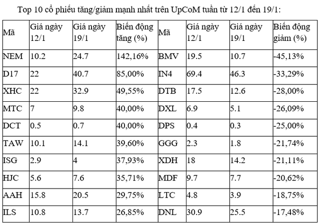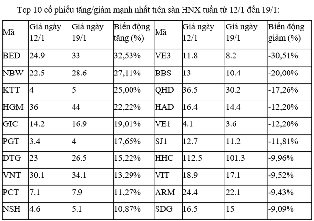 Trên sàn HNX, nhóm cổ phiếu tăng, giảm mạnh nhất tuần này ít có diễn biến đáng chú ý nào đáng kể khi đa phần giao dịch ảm đạm với thanh khoản thấp.