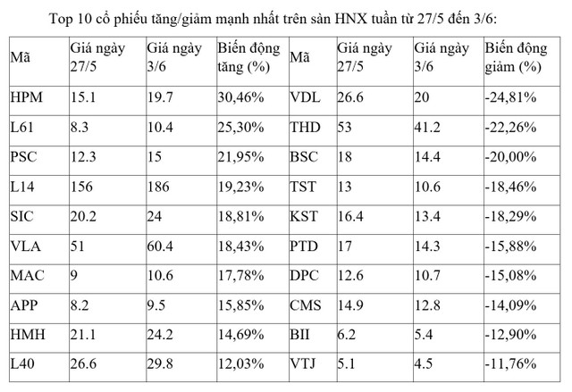 HNX-Index giảm 0,69 điểm (-0,22%), xuống 310,48 điểm. Giá trị giao dịch trên HNX tăng 16% so với tuần trước đó với 10.253 tỷ đồng, khối lượng giao dịch tăng 3,7% lên 420 triệu cổ phiếu.