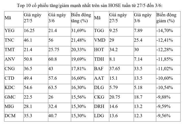 Trên sàn HOSE, ở nhóm cổ phiếu tăng mạnh nhất đáng chú ý có YEG, với cả 5 phiên đều tăng, trong đó có 3 phiên tăng kịch trần liên tiếp từ 30/5 đến 01/6.