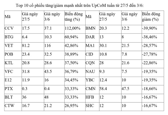 Trên UpCoM, cổ phiếu CCV của CTCP Tư vấn Xây dựng Công nghiệp và Đô thị Việt Nam có mức tăng vượt trội. Nhưng giao dịch ảm đạm, với 4 phiên có giao dịch thì chỉ có 100 đơn vị khớp lệnh/phiên.
