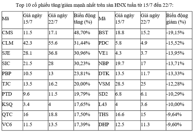 Trên sàn HOSE, cổ phiếu tăng mạnh nhất là ST8, với cả 5 phiên đều tăng, trong đó, có hai phiên tăng trần ngày 18 và 22/7. Thanh khoản có sự gia tăng đáng kể so với thời gian trước đó. Thông tin mới liên quan đến ST8 là việc ngày 28/7 tới đây sẽ chốt danh sách cổ đông tạm ứng cổ tức đợt 1 năm 2022 bằng tiền mặt lên tới 85%.