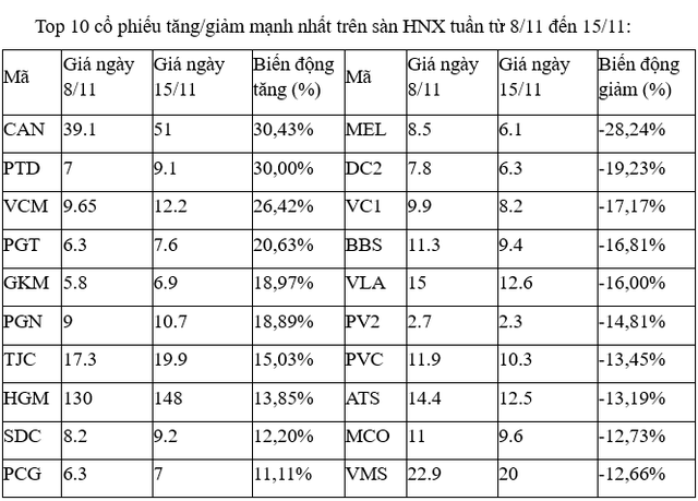 Đáng chú ý là sự xuất hiện của VTP, khi có tuần thứ hai liên tiếp lọt vào top những mã tăng cao nhất sàn với điểm nhấn trong hai phiên ngày 12 và 15/11 khi đều tăng kịch trần. Tuần trước cổ phiếu này tăng hơn 22%.