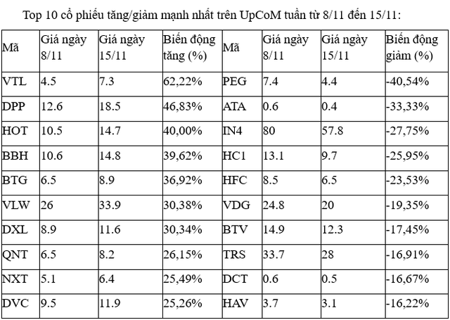 Trên UpCoM, các cổ phiếu biến động mạnh nhất tuần này vẫn thiếu điểm nhấn, khi thanh khoản khớp lệnh trong các phiên giao dịch chỉ dừng lại ở mức rất thấp.