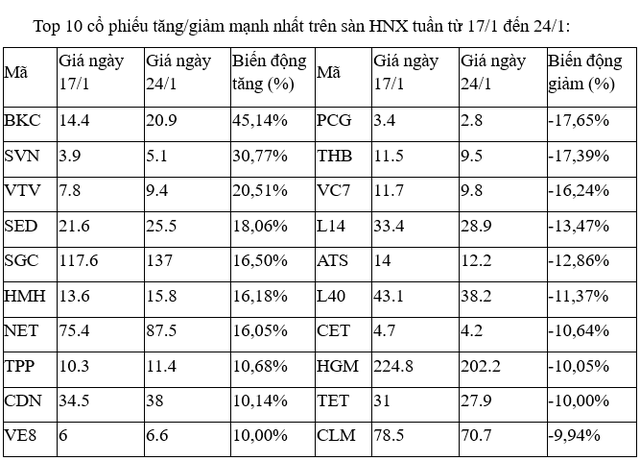 Trên sàn HNX, nhóm các cổ phiếu tăng, giảm mạnh nhất trong tuần hầu hết giao dịch thưa thớt, thanh khoản yếu. Chỉ một số cổ phiếu như VTV, SVN, L14 khớp lệnh vài trăm nghìn đơn vị phiên.