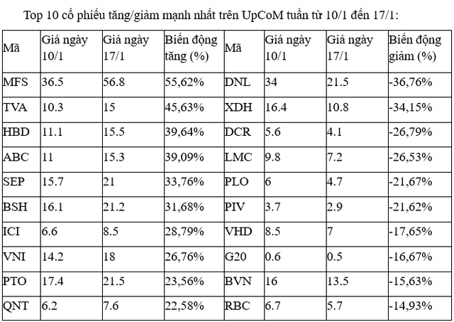 Trên UpCoM, cổ phiếu MFS của CTCP Dịch vụ Kỹ thuật Mobifone (Mobifone Service) tăng vọt hơn 55%, cao nhất UpCoM và đồng thời cao nhất toàn thị trường, đi kèm thanh khoản cải thiện đáng kể so với thời gian trước đó.