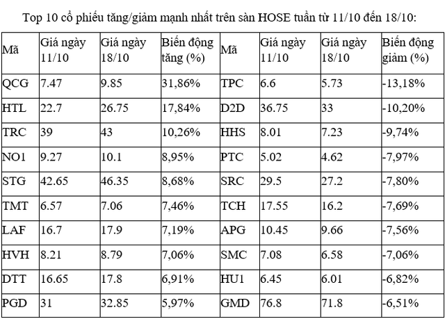 Top 10 cổ phiếu tăng/giảm mạnh nhất tuần: Cổ phiếu QCG tăng vọt