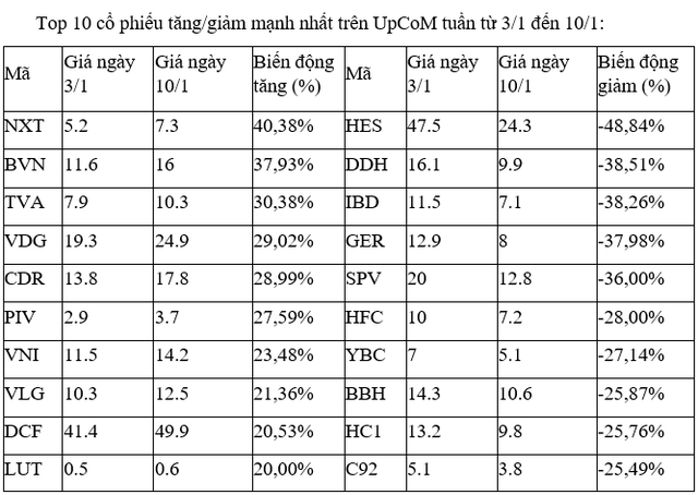 Trên UpCoM, phần lớn các cổ phiếu biến động mạnh nhất trong tuần về giá đều giao dịch khá ảm đạm với thanh khoản thấp. Ngoại trừ phần nào đó là hai cổ phiếu PIV, VLG ở chiều tăng mạnh, khi khối lượng khớp lệnh vài trăm nghìn đơn vị/phiên, dù cũng tương đối trồi sụt.