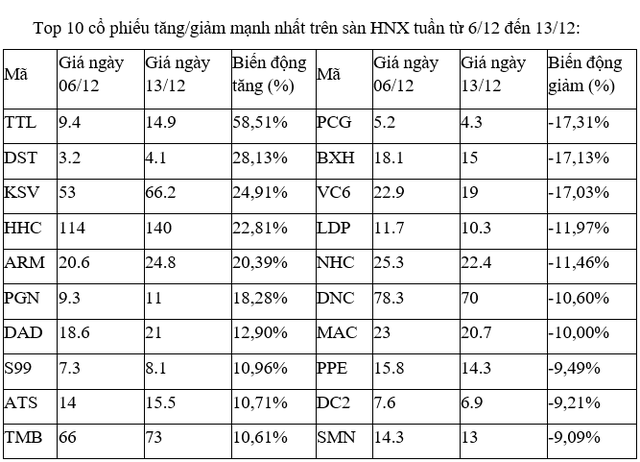 Trên sàn HNX, cổ phiếu TTL tăng vọt và bỏ xa phần còn lại với cả năm phiên đều tăng kịch trần, nhưng thanh khoản thấp với chỉ trên dưới 5.000 đơn vị khớp lệnh, ngoại trừ phiên cuối tuần khi đột biến có hơn 250.000 cổ phiếu được sang tay.