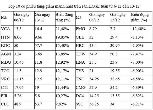 Trên sàn HOSE, cổ phiếu VCA của CTCP Thép Vicasa – Vnsteel có thêm một tuần dẫn đầu trong số các mã tăng mạnh nhất. Tổng cộng mã này đã ghi nhận 11 phiên tăng trần liên tiếp kể từ phiên 28/11 đến 12/12, nhưng đã chịu lực bán chốt lời trong phiên cuối tuần 13/12 khi giảm sàn, khớp lệnh hơn 0,34 triệu đơn vị. Tuần trước, cổ phiếu này tăng gần 40%.