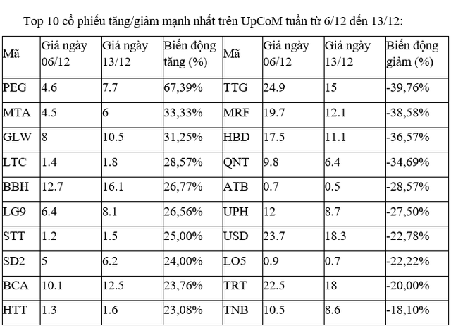 Trên UpCoM, đa phần các mã tăng, giảm mạnh nhất đều thanh khoản thấp. Ngoại trừ cổ phiếu MTA, khớp lệnh bất ngờ phiên cuối tuần hơn 0,29 triệu đơn vị, trong khi các phiên còn lại chỉ 30.000-40.000 đơn vị khớp lệnh.