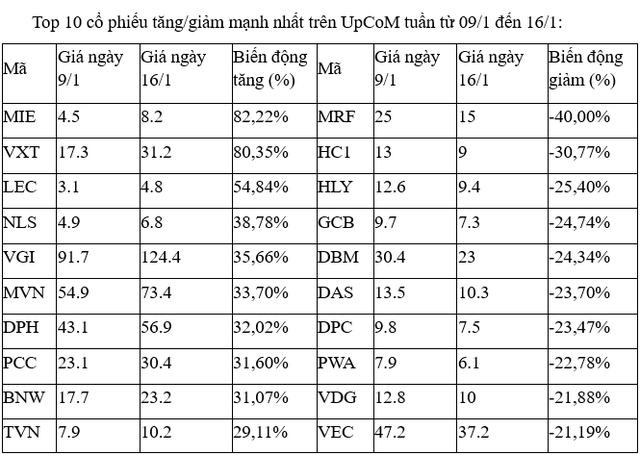 Trên UpCoM, cổ phiếu VXT, VGI có tuần thứ hai liên tiếp tăng mạnh, dù chỉ VGI có thanh khoản là đáng kể trong các phiên giao dịch.