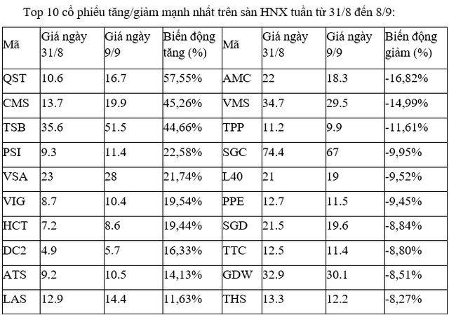 Đáng chú ý là QCG, khi có tuần thứ hai liên tiếp lọt vào top những mã tăng mạnh nhất, sau khi tuần trước +19%. Dù vậy, áp lực bán chốt lời cũng đã xuất hiện khi trong phiên cuối tuần 8/9, cổ phiếu này đã giảm sàn.