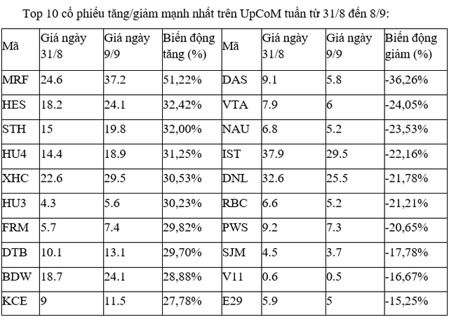 Trên UpCoM, đa phần các cổ phiếu tăng, giảm mạnh nhất đều giao dịch yếu, thanh khoản thấp, ngoại trừ STH, HU4, trong đó, HU4 đã có 11 phiên liên tiếp tăng dù gần đây không có thông tin nào mới đáng kể.