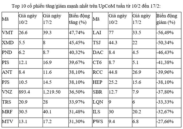 Trên UpCoM, cổ phiếu VNZ của CTCP VNG tiếp tục nhận được sự quan tâm lớn, sau khi đã tăng tới hơn 100% trong tuần từ 3/2 đến 10/2.