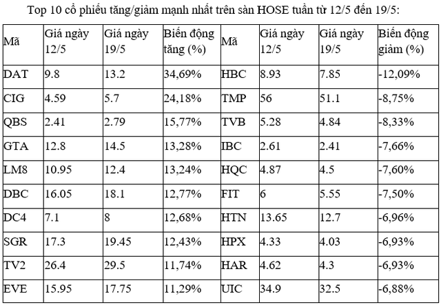 Trên sàn HOSE, nhóm cổ phiếu tăng mạnh nhất vẫn chiếm phần lớn là các cổ phiếu vừa và nhỏ, với giao dịch tương đối sôi động trong các phiên có thể kể đến QBS, DBC, TV2 và EVE. Trong đó, QBS có tuần thứ hai lọt vào top các cổ phiếu dẫn đầu sau khi tuần trước là cổ phiếu tăng mạnh nhất khi +30,3%.