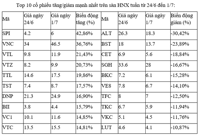 Trên sàn HNX, nhóm cổ phiếu tăng, giảm mạnh nhất đa số đều là các cổ phiếu vừa và nhỏ, dù vậy, ngoài BII ở các mã tăng cao và VKC ở nhóm giảm sâu có giao dịch tương đối sôi động trong các phiên, còn các cổ phiếu còn lại đều chỉ có thanh khoản thấp.