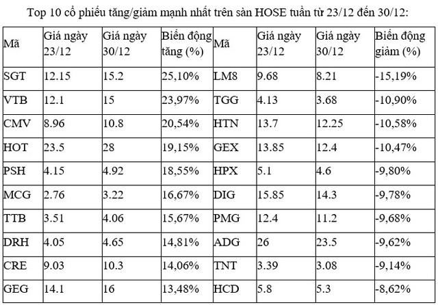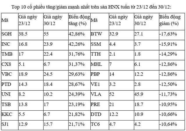 Trên sàn HNX, nhóm các cổ phiếu tăng, giảm mạnh nhất tuần này không có nhiều điểm đáng chú ý, khi phần lớn chỉ giao dịch trên nền thanh khoản thấp.