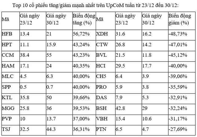 Trên UpCoM, cổ phiếu HFB của Công trình Cầu phà TP.HCM có tuần thứ hai liên tiếp là cổ phiếu tăng mạnh nhất, sau khi tuần trước tăng gần 72%. Dù vậy, giao dịch trong phiên của cổ phiếu này không đáng kể, thậm chí có phiên còn trắng thanh khoản.