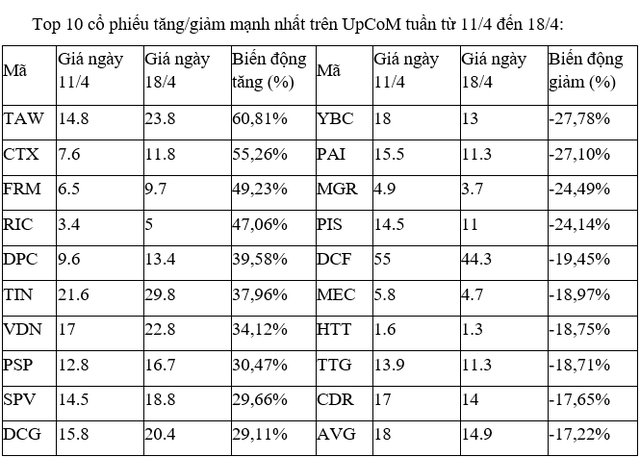 Trên UpCoM, các cổ phiếu biến động mạnh nhất tuần này đều giao dịch thưa thớt, thanh khoản kém, không có diễn biến đáng kể nào trong các phiên.