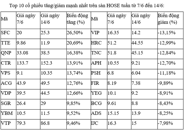 Đáng chú ý là sự xuất hiện của hai cổ phiếu nhà Viettel CTR và VTP khi có tuần khởi sắc, trong đó, CTR bứt phá mạnh mẽ trong hai phiên ngày 13 và 14/6 với mức tăng gần 7% mỗi phiên.