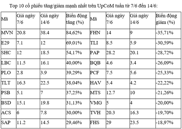 Trên UpCoM, các cổ phiếu tăng, giảm mạnh nhất tuần qua đa phần là các mã thị giá nhỏ. Đồng thời, thanh khoản cũng không cổ phiếu nào nổi trội khi đa số chỉ vài chục nghìn đơn vị khớp lệnh/phiên.