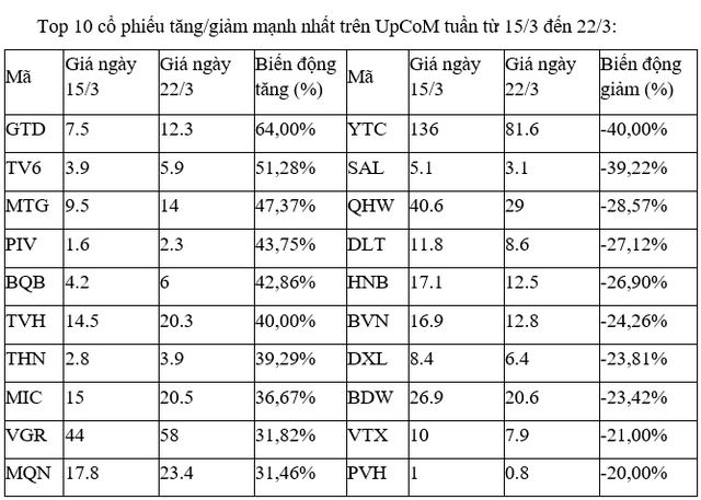 Trên UpCoM, đa phần các mã tăng, giảm mạnh nhất ít có diễn biến đáng kể nào, khi đều thanh khoản thấp, hoặc trồi sụt trong các phiên.