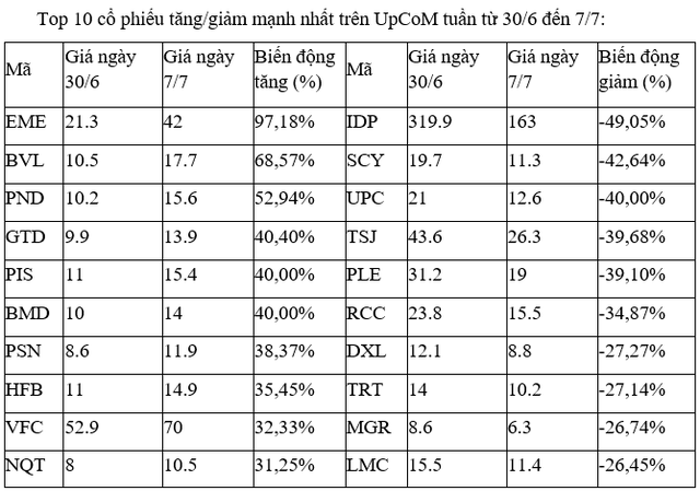 Trên UpCoM, các cổ phiếu tăng, giảm mạnh nhất tuần này đều giao dịch thưa thớt, không có diễn biến mới nào đáng kể.