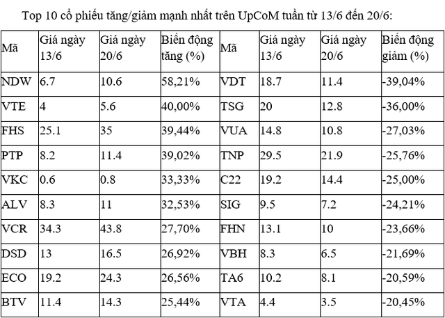 Trên UpCoM, các cổ phiếu biến động tăng, giảm mạnh nhất trong tuần đều giao dịch khá ảm đạm với những phiên khớp lệnh khối lượng thấp, trồi sụt. Ngoại trừ cổ phiếu ALV, nhưng cũng chỉ trên dưới 0,2 triệu đơn vị/phiên.