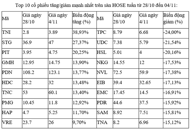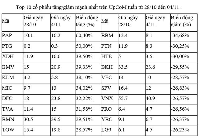 Trên UpCoM, các cổ phiếu biến động mạnh nhất tuần này cũng không có nhiều điểm đáng chú ý nào, khi khối lượng giao dịch trong phiên đều chỉ ở mức thấp.