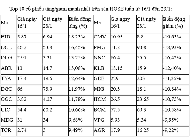 Trên sàn HOSE, nhóm các mã tăng cao nhất đa phần chỉ nhích trên dưới 10% cho thấy tuần giao dịch ngắn hạn đầy khó khăn và phần lớn là các cổ phiếu vừa và nhỏ, có tính đầu cơ cao như HID, DLG, OGC, ABR.