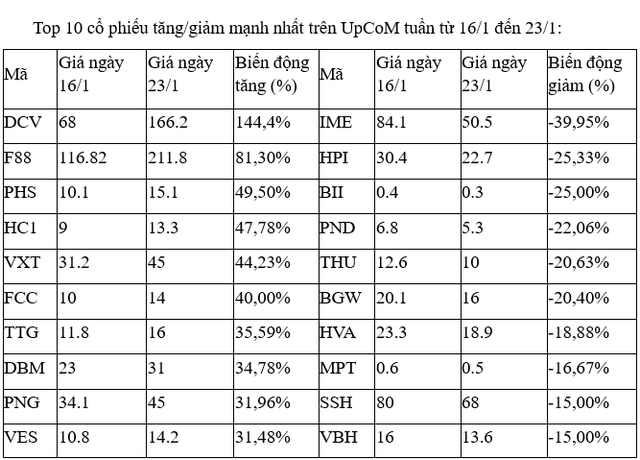 Điểm nhấn trên UpCoM là tân binh DCV của CTCP Quản lý quỹ đầu tư Dragon Capital Việt Nam với phiên giao dịch đầu tiên ngày 19/1, giá tham chiếu 68.000 đồng và cổ phiếu này liên tiếp tăng hết biên độ trong cả năm phiên, đưa giá cổ phiếu lên 166.200 đồng, tương ứng mức tăng hơn 140%. Tuy nhiên, khớp lệnh trong các phiên chỉ ở mức thấp với vài trăm đơn vị.