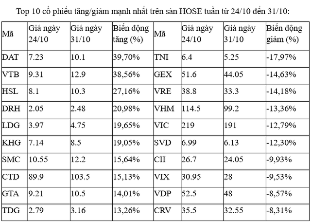 Trên sàn HOSE tuần cuối tháng 10, nhóm các cổ phiếu tăng tốt nhất hầu hết là các mã nhỏ, có tính đầu cơ cao với sự góp mặt của SMC, KHG, LDG, DRH, HSL, VTB, phản ánh sự dịch chuyển một phần của dòng tiền khi diễn biến ở các nhóm trụ, cổ phiếu đầu ngành khác đang khó lường.
